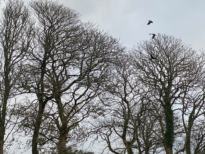 Then last night I took part in an all night gong-bath from which I still feel quite drowsy and somewhat strange. Five women took turns in playing an array of eight enormous elemental gongs while 15 of us lay wrapped in blankets on the floor of an old beautiful barn immersed in the sound, with a crackling wood-fire keeping us warm. To me it felt like the whole thing became like a huge breathing being over the course of the night - either in the deep ocean, like swimming with a whale, or up in space with the stars - I later found out that one of the gongs was indeed called a ‘planetary gong’. It felt amazing to just surrender to the sound, with images and even a visceral feel at times of floating through the ocean and / or space, like a half-waking dream. I did properly fall asleep for a while in the midst of it all and promptly had a hilarious dream of my german friend coming crashing into the proceedings starting to loudly talk to everyone in german, not noticing or realising that we were all in a meditative silence - she seemed unstoppable and I burst out laughing in the dream - maybe that was my own irreverent side coming through? It was funny in that context that stepping out into the field with my cup of breakfast chai in the morning I was immediately greeted by an exuberant puppy excitedly laying a stick at my feet, so there was no chance of any more meditative musing - though I did take a few evocative pictures of the rooks in the filigree leafless trees, during moments when the puppy ran for the stick.